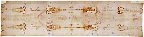 I medici legali sono stati i primi a studiare i numerosi segni sul corpo dell’uomo impresso sul lenzuolo: gli angoli delle colature indicano che l’uomo assunse due diverse posizioni sulla croce; il tronco e il dorso presentano oltre cento segni tondeggianti, disposti a coppie, causati probabilmente da flagellazioni. Sul lato destro del petto è visibile una ferita ovale (4,5 x 1,5 cm), provocata da un’arma da punta e taglio, penetrata nel quinto spazio intercostale destro. La ferita, inflitta dopo la morte, ha lasciato una grande chiazza di sangue circondata da un alone sieroso, tipico del sangue cadaverico, in cui si è già separata la parte sierosa da quella corpuscolata. La colatura continua sul dorso all’altezza delle reni, evidentemente per uno svuotamento della cavità toracica al momento della deposizione in orizzontale e del trasporto del cadavere. Sul dorso della mano sinistra, all’altezza del polso, si nota una chiazza di sangue con due colature divergenti, causata da un chiodo che ha perforato la mano dall’interno verso l’esterno. Da rimarcare che gli angoli formati dalle direttrici delle colature del sangue fuoriuscito dalla stessa ferita indicano che mentre il sangue sgorgava l’uomo assumeva due diverse posizioni sulla croce. L’impronta del piede destro è completa e mostra il foro di uscita del chiodo, mentre quella del piede sinistro è parziale. Colature di sangue sono visibili sia verso le dita (emorragia durante la crocifissione) sia verso il calcagno (versamento al momento della deposizione).